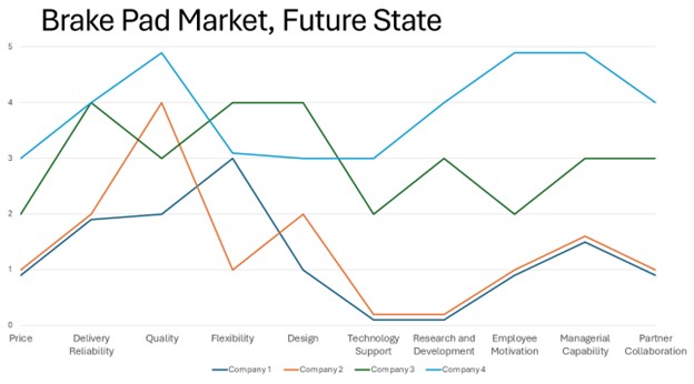 After the completion of the current state canvas, the future state can be considered. While the desires of the brake pad customers are changing, the technologies available to the manufacturers are too. Their strategy development integrates understanding of customer needs, the technologies available to the manufacturers and how they may be applied, and any knowledge that is available of the strategies being adopted by competitors. The future state Business Strategy Canvas includes the larger number of competitive factors that are now important in the brake pad market.